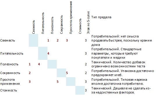 - В матрице зашита возможность проверки (не полной, но все же). Для чего и рассматриваем этап развития и тип предела. Например, конфликт 3 (Свежесть конфликтует с простотой применения). По обоим параметрам мы маркировали систему на 3 этапе с потребительским пределом. То есть, потребителю просто дана возможность выбора – конфликта нет…
