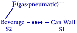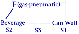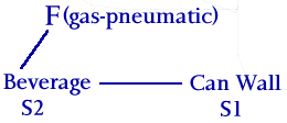 This function illustrates the useful interaction that occurs between the liquid beverage and the can wall. Note that every function has the form: "Subject acts on Object," which can be described as "The active action of a tool, or instrument, on the passive object being worked on." The form of this function has the following sequence: "SUBJECT-VERB-OBJECT." The "object" is the element that is being worked on. In TRIZ, this is often referred to as the "artifact," or "Substance 1," or merely "S1." The "subject" is the element that is doing the work, or performing the functional action. This is often called the "instrument," the "tool," "Substance 2," or merely "S2."