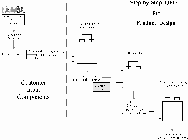 Comprehensive QFD has more depth in the analysis. The flowchart looks very much like Bob King's matrix of matrices, but is a true flowchart. Kings matrices are just a listing of possible analyses. The TRIZ and Taguchi hooks in the five-step QFD are also present in the comprehensive QFD. The additional hooks in the comprehensive QFD were mentioned previously as activities to be continued in an organizations design process.