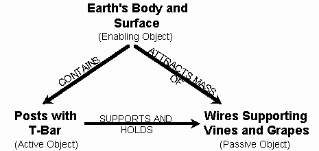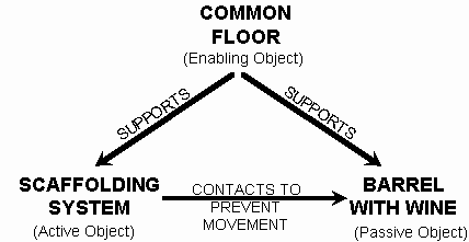 The Triad involved in this system includes - of course - three objects. The passive object is a barrel filled with wine. The suggested active object is the scaffolding system that "contacts" the barrels, preventing them from moving. The "enabling" object that makes this "contacting" interaction possible is the common floor surface shared by the barrel system and the scaffolding system: