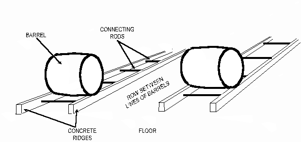 The barrels are supported and elevated above the floor level by two concrete ridges that are in turn connected by steel rods. For purposes of clarity of illustration, only two barrels are shown in the figure above.