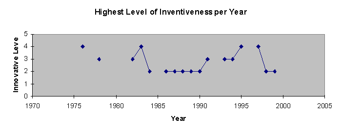 Figure 5.0: The highest level of the inventiveness is represented per annum as an