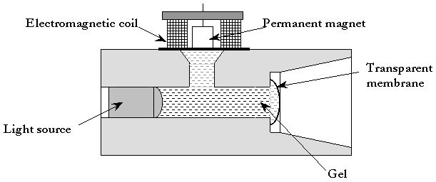 A system using electromagnetic energy is shown in Fig. 12. To change the curvature of the lens surface, the pressure should be applied to the gel. A small strong magnet, controlled by a magnetic coil, applies pressure to the gel, which causes bulging of the lens surface and, consequently, changing of the focal distance.