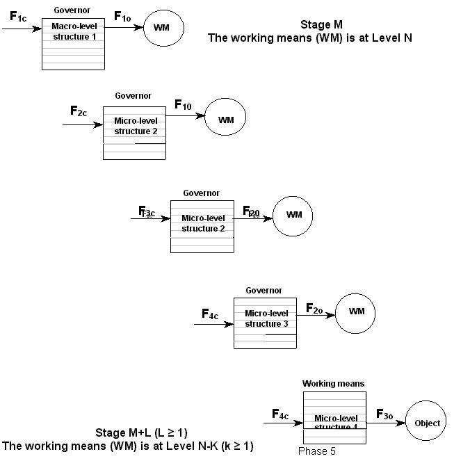 Fig. 9Suppose, the control field acts on the lowest level available in the given governors substance. What is the next step of evolution? Now, it is the working means turn to move down the substance hierarchy. The working means substance is replaced with a new one; concurrently, a new control field that can interact with the new substance may be introduced into the system.
