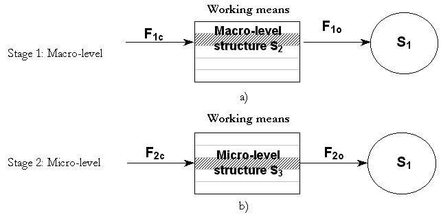 A schematic representation of transition to a micro-level (in its conventional understanding) is shown in Figs. 5a, b. The schematics reflects an immediate transition of a working means from a macro-level substance structure (i.e., S2) to a micro-level structure (i.e., S3). In the beginning, Fig. 5a, a control field F1c makes S2 generate an operation field F1c that is applied to an object S1; both fields act at the same macro-level of the substance structure (the substance hierarchy is shown with the help of the grid inside the block representing the substance). Transition to a micro-level, Fig. 5b, may require changing the substance structure (from S2 to S3) and both control and operation fields.