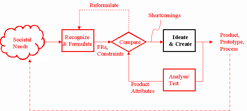 In essence, the two axioms are analytical in nature. Suh uses a feedback control loop analogy in describing the design process (Figure 1). Given a set of input conditions, societal needs, and a desired output - the product, prototype or process - the analogy indicates the presence of a black box ideate and create synthesis capability - through which a designer somehow generates a candidate design solution based on the inputs. The two Axioms are then used as analytical tests (i.e. the feedback part of the analogy) of how 'good' the synthesised solution is.
