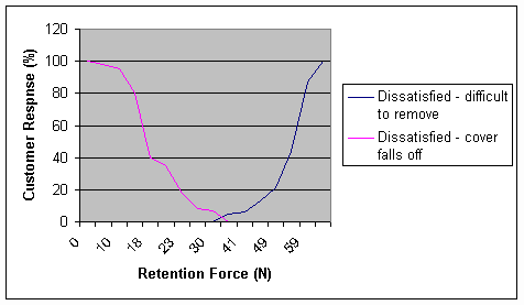The example comes from work done at General Motors. Back in the early 80s, the book records, the designers at GM had a problem with wheel covers. GM wheel covers at the time were held on by simple spring clips. The problem the designers faced was that, if spring force was too small, the wheel covers fell off, and, if the spring force was too high, vehicle owners found it difficult to remove the cover when a wheel change was required. Suhs book describes the high degree of scientific rigour and customer focus employed by the GM designers during the search for a problem solution: They conducted a series of sophisticated customer trials using wheel covers with different spring forces and systematically measured how satisfied the customers were with each of the different cases. The results are summarised in Figure 5. Very simply, they found that 100% of customers were satisfied from the perspective of ease of cover removal if the force required to remove the cover was 30N or less, and that 100% of customers were happy that their wheel-covers wouldnt fall off if the retention force was 35N or more.