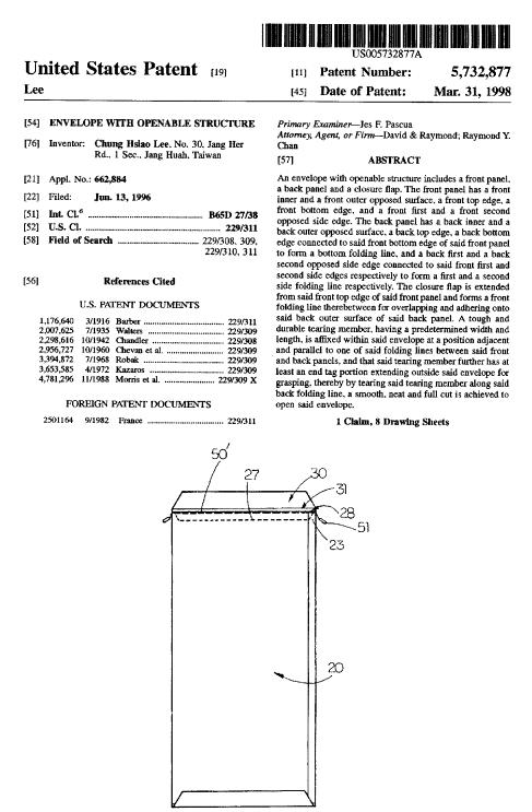 The conceptual design of tearing envelopes comes from the principle “Prior Action” is placing a tearing line or strip on the closure flap before envelopes are sealed. This device is granted a United States patent as shown in Figure 2. Similarly, for the technical contradictions of RELIABILITY/CONVENIENCE OF USE and LOSS OF INFORMATION/LOSS OF TIME, the principles “Transition into a New Dimension” and “Mediator” from the Contradiction Matrix are concerned, respectively. Of the skills suggested by the principle “Transition into a New Dimension ” are including :