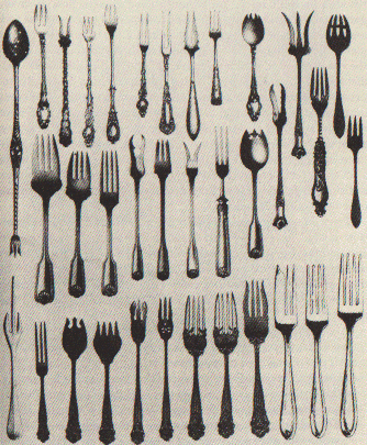 One of the most interesting historical accounts in the book concerns the evolution of the eating implement we know as the fork. The fork story begins in the Middle Ages, when diners would usually be found eating with a pair of knives; one knife to do the cutting, and the other to take care of the holding of the food being cut. This method of eating prevailed - in Europe at least - until around the 14th Century, when two-tined forks first appeared in large quantities at the dinner table. It is suggested that the evolution from pointed knife to two-pronged fork occurred because of the problems of holding food in place with a single pointed device where the food in question was largely free to rotate about the point and thus impeded the cutting action. Introduction of the second prong eliminated this rotation problem.