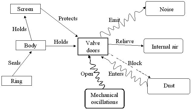 In order to avoid discomfort or safety problems to the passengers, a car must have an air exhaust valve that relieves the internal air pressure generated when the ventilation system is on or, in a more critical situation, when an air bag is inflated. A certain car’s exhaust valve was properly and safely accomplishing its “relieve air pressure” function, but another harmful effect was present: “dust gets into the car”. The valve consists of a box fixed to a opening in the car body. Inside the box are six little plastic molded doors, inclined with respect to the vertical plane, which close by their own weight and open under a certain air pressure level built inside the car. In this case, the functional diagram of Figure 4 clearly showed that the core problem was the harmful function: “mechanical oscillations from car displacement shake and open valve doors, which then make rattle noise and let dust get in”, so it was not necessary to build a CRT.