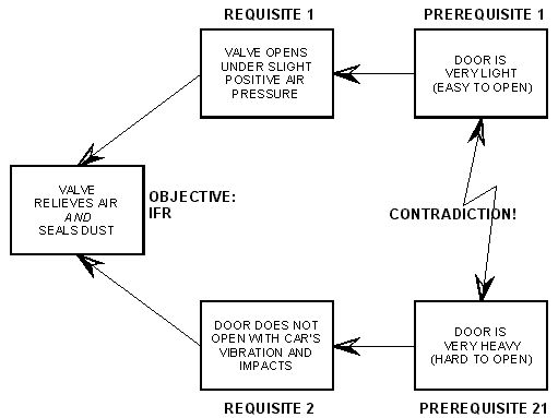 From that clear problem statement we decided to use a CRD in order to identify a technical conflict or, preferably, a physical contradiction behind the situation. Starting from the ideal final result “valve relieves any excess internal air pressure and does not let any dust get inside” as the CRD’s objective (Figure 5), we worked down to two conflicting prerequisites, thus highlighting the physical contradictions (“door must be easy to open and door must be hard to open”; “door must be light and heavy”) which opened a nice path to an extremely simple, cheap and very effective solution. Incidentally, the author believes that this case was the very first industrial application of TRIZ in Brazil.