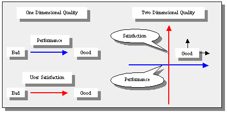 In the late 1970s Dr. Noriaki Kano of Tokyo Rika University further refined the notion of quality derived partially from his study of Herzberg's "Motivator-Hygiene Theory." Whereas many of the previous definitions of quality were linear and one dimensional in nature, i.e., good or bad, small versus large loss to society, Dr. Kano integrated quality along two dimensions. The two dimensions were: 1) The degree to which a product or service performs, and 2) The degree to which the user is satisfied. See Figure 1.