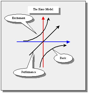 The Kano Model is very useful in providing a level of sophistication not available in a one-dimensional model of quality. If the level of customer satisfaction is plotted on a vertical axis, and the degree that the product or service has achieved a given performance attribute on the horizontal axis, different types of customer wants and needs can be shown to cause widely different responses. The model shows that the customer's responses can be classified into three types as shown in Figure 2 above, i.e., Basic, Performance and Excitement.
