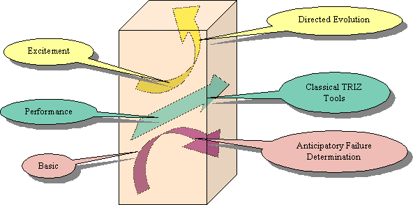 Just as the Kano Model is composed of three elements, the TRIZ interface is likewise composed of three separate but complementary subsets including: 1) Anticipatory Failure Determination1 (AFD), 2) Classical TRIZ Problem-Solving Tools, and Directed Evolution2 (DE). Anticipatory Failure Determination and Directed Evolution are the latest additions to the TRIZ "toolbox." Both AFD and DE have been developed through the Kishinev School under the leadership of Boris Zlotin and Alla Zusman. The classical tools of TRIZ are the product of Altshuller's patent work from 1946 to 1985.