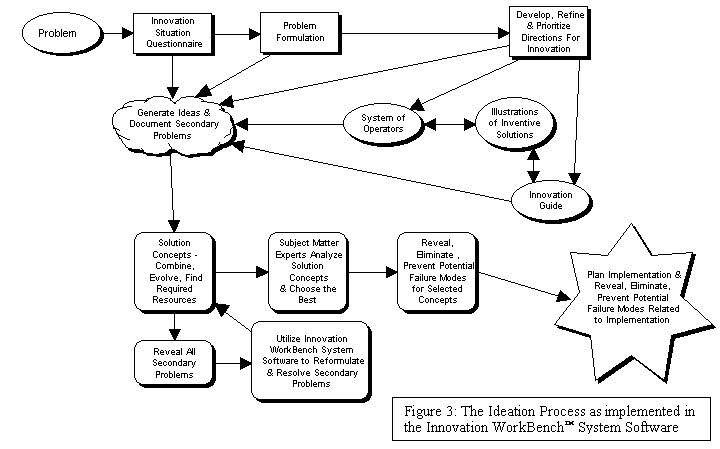The cloud-shaped node in Figure 3 represents a significant point of differentiation between the Ideation Process and traditional brainstorming. Traditional brainstorming (which is based on the work of Alex Osborn) separates idea generation from the critique and evaluation of the ideas. Extensive psychological research by TRIZ scientists has revealed that this is effective for solving low-level problems, but not for solving complex technological problems. These findings are based on two factors: