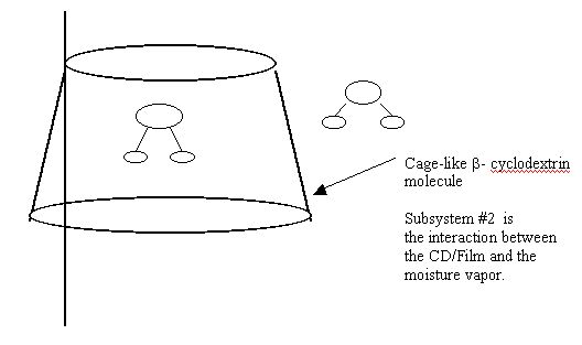 b-CD molecules chemically bound to the substrate. The first subsystem is the interaction between the dangerous chemical molecules, the barrier substrate, and the b-CD molecules. When y touches the barrier, nothing happens. There is no chemical reaction between the particle and the barrier. If there is any sort of electrical charge on either the substrate or the molecules, there could be some small attractive or repulsive force. However, when the particles come in contact with the cage-like molecules, the molecule becomes bound to the cage-like molecules. In this manner, the dangerous particle cannot pass through the film.The
