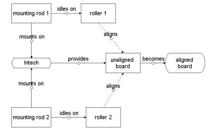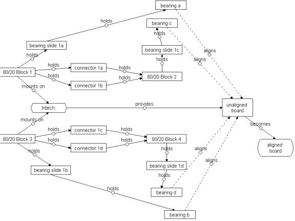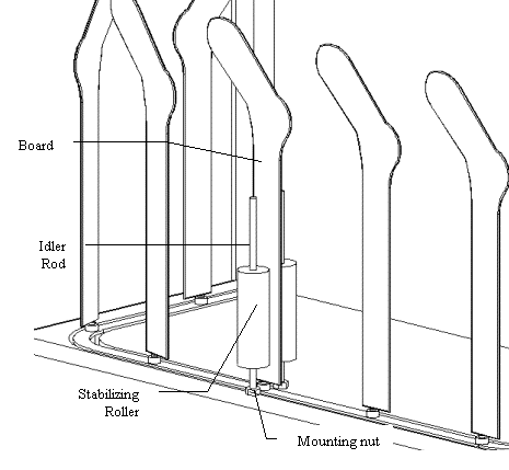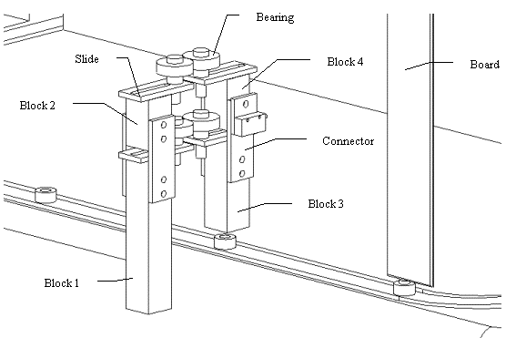 The number of parts used in this assembly was far too large for the purpose it served. The functionality of the stabilizer was also deemed insufficient because boards that were bent above the stabilizing assembly would not be aligned properly. The stabilizer mechanism has no effect on the board above the assembly. This fact is compounded for taller boards. Figure 3-13 is a functional diagram of the board stabilizer showing how many components are used to simply align the board.