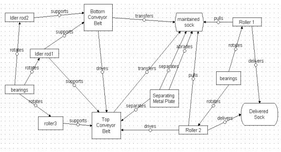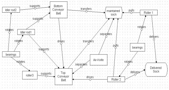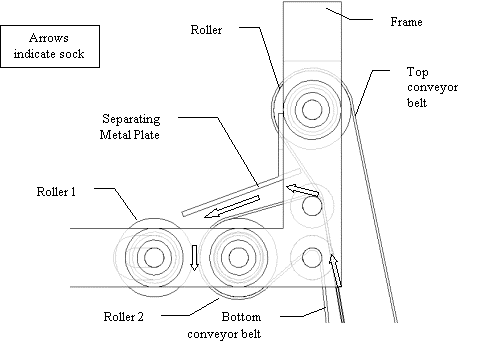 Socks exit the sandwiching conveyor belts when the sock reaches the top of the machine. Socks then follow the bottom belt until it reaches the opening area. Problems occur when the sock follows the top conveyor instead of the bottom. Friction of the sock with the top conveyor belt causes fibers to get caught which pulls the sock with the belt. Originally a metal plate was used to separate the sock from the top belt. This function was insufficient, because it often jammed the sock. The metal plate also caused sock abrasion, which is a harmful effect. A solid model and functional diagram of the process where the sock exits the conveyor belt can be seen below in Figures 3-17 and 3-18. The insufficient separation action and harmful abrasion action are shown to be a dotted line and red line, respectively in the functional diagram.
