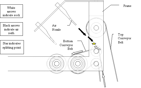 The specific problem of the sock getting caught on the top conveyor belt must be worded into a general problem. The two parameters chosen that best fit the problem were 'reliability' and 'complexity of device'. It was desired to increase the reliability of the device without the engineering tradeoff of increasing its complexity. There were three principles suggested in the contradiction matrix to solve this problem but none of them appeared to apply in this case. The principle 'use a hydraulic or pneumatic construction' appeared to have a possible application. Instead of using a solid piece of metal to separate the sock and the conveyor belt, an air nozzle with a thin air profile could be used. The nozzle would create an “air knife” that would flow along the surface of the top belt and thus would peel the sock away. The air knife could not have the harmful effect of jamming the sock because there is nothing physical to create a pinch point. A solid model of the air nozzle separating the sock from the belt can be in Figure 3-19.