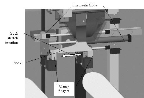 Socks are loaded onto the boards using metal 'fingers' that slip into the open end of the sock. There are four fingers altogether two of which are inside the sock while the other two grip the sock from the outside. These metal 'fingers' work similarly to a human finger and thumb. Each inside/outside finger pair of is attached to a pneumatic clamp. Once the sock has been placed over the fingers by the 'opening' subassembly the sock is widened by a horizontal pneumatic slide that one of the clamps is mounted to. The sock is then pulled over the board. This process can be read in more detail in section 4.2 Mechanical Design. A solid model of the sock being held by the fingers and widened by the pneumatic slide can be seen below in Figures 3-21. The functional diagram, Figure 3-22, shows the harmful effect of stretching the sock caused by the horizontal pneumatic.