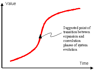 In relation to the first question being posed in this article – where and when on a technical system evolution S-curve does the trimming process begin to take effect – the implications from Salamatov’s TRIZ text and the suggestion here based on an analysis of the gas-turbine evolution picture is that the transition from expansion to convolution stages occurs at or around the point on the overall value S-curve where the slope of the characteristic stops increasing, and begins decreasing – Figure 5.