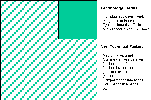 The S-curve – complexity relationship is potentially useful in identifying the relative maturity of an industry (see Reference 3 also). Of course, the trend – along with all of the existing known TRIZ trends of technology evolution are just a small part of a much bigger picture – Figure 7 – in that strategic decisions on how future R&D budgets should be allocated depend on far more than just the engineering possibilities. The complexity (or we might call it ‘trimming’) trend, however, provides a useful technical steer, indicating the emergence of a limiting contradiction between the desire to obtain performance benefits and the increasing prohibitive cost and overall engineering difficulty of achieving such benefits.