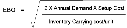 This case comes from an article written about the use of TOC to avoid ‘trade-off’ solutions (Reference 4). The case surrounds the commonly found manufacture issue of calculating batch sizes in a production environment. The calculation of ‘optimum’ batch size – usually called Economic Batch Quantity (EBQ) – has developed into a sophisticated science. The basis of the EBQ calculation process derives from an established relationship with annual demand, machine set-up cost, and inventory carrying cost per unit. The mathematical relationship is:-