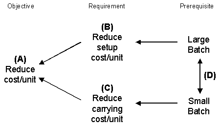 By way of example, the Reference 4 article challenges the assumption contained in the arrow between B and D that large batches are a prerequisite for reducing setup costs. If means are found to break the perceived relationship – for example if a setup is being performed by workers who would be on the payroll whether a setup was being performed or not (and saleable output is unaffected by the downtime) – then the problem is solved.
