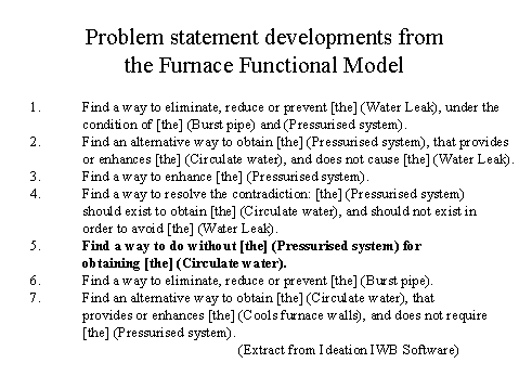 The design focus is initially on the problem of explosions occurring when a traditional pressurised cooling system and the incident of a burst pipe results in a water leak. Functional modeling is normally used early in the TRIZ process to map the system’s useful functions, but also the harmful effects and their remedy. For example the cooling system is there to counter the harmful effect of the heat on the furnace walls. The model also effectively identifies contradictions. This diagram shows two physical contradictions, one associated with ‘heat furnace’ and the other with ‘pressurised system’. The problem formulation operators are then used to challenge the assumptions behind each arrow. The application of these operators has been incorporated into the Ideation IWB software (10) and has been used to generate the following statements, which have been restricted to the ‘pressurised system’ function block links. The problem formulation for the whole diagram amounts to over 30 statements.