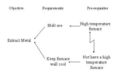 In the above cloud the BD and CD arrows raise assumptions that if broken would potentially provide much stronger solutions. For example, the problem solver might challenge the assumptions that melting ore requires a hot furnace, or that a hot furnace
