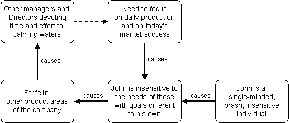 This case originates from an article by Jim Kowalick on the use of TRIZ in the solution of human relations problems (Reference 11). The case – slightly restructured here to overcome some simplifications made in the original case, relates to John. John is a successful line-manager, but his brash nature is adversely impacting the performance of areas of the organisation other than his own. The problem scenario is illustrated in Figure 7.