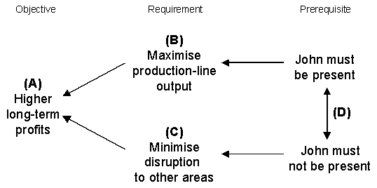 This contradiction is expressed in the TOC Evaporating Cloud (EvC) as the pair of opposing problem 'prerequisites’. Construction of the full EvC is then intended to systematically identify the assumptions which relate the conflict to the requirements and objectives of the business. A comprehensive explanation of the EvC and its use may be found in Reference 6.