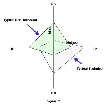 The validity of the OE instrument is not in question as it has been used in the public and private sector on over 10,000 individuals and more than 1,000 teams. Given the size of the database, several patterns have emerged as to preferential decision making styles that dominate technical and non-technical individuals. These styles are shown in Figure 3. This information provided the test data to ascertain the applicability of TRIZ to non-technically oriented persons.