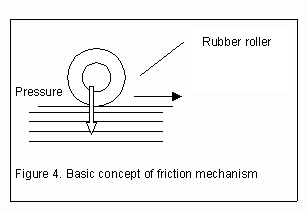 The function of the paper handling mechanism used in an automatic teller machine is “isolate one bill from piled bills”, which is the first FR of the system. Several physical structures can be used to realize this functional requirement, such as friction, vacuum and leafing etc. Friction method is selected and its mechanism is showed in figure 4.