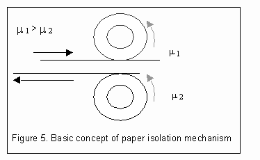 However, this DP does not always work correctly because the friction is changeable under some circumstances. If the friction force working on the tope of bill becomes too large by some accident, two or more bills will be sent forwards, and if it becomes too small the top bill may not be isolated. So, we have to decompose the first level functional requirement into two functional requirements: “give a forward force to the first bill” and “give a backward force to the second bill”. To satisfy these two requirements, the new DP of this design is a pair of rollers rotating in the same direction shown in figure 5. Furthermore, the friction coefficient of the upper roller is large than that of the lower roller.