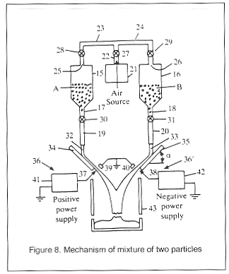 If particle A and B have same electrostatic charges, they are exclusive. However, opposite electrostatic charges provide internal forces among particles. So, a perfect mixture might be realized if component A takes positive charge and B negative charge. In order to make particles A and B have the opposite charges, they should combine with the ionized air particles as they pass between the electrodes, so as to impart a positive and negative charge on the particles, respectively.
