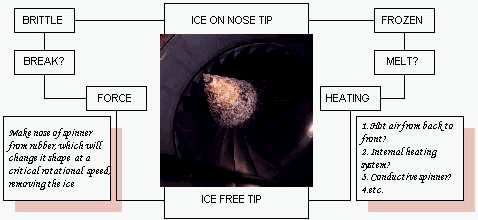 The figure below draws out a solving procedure. A gas-turbine nose spinner is frozen. One ‘obvious’ solution route suggests heating of the spinner, as the ‘normal’ way of removing ice is to melt it. Reformulating the problem to ‘removing the ice’ however, creates a distinctly different route. The figure illustrates a structure of how the spinner could have been derived using traditional creativity methods.