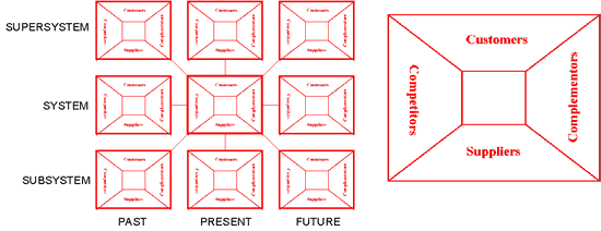 The Co-opetition idea of a ‘value net’ is of significant interest when thinking about a holistic approach to business oriented problems. This becomes particularly so when taken together with the TRIZ ‘9-windows’, ‘multi-screen’ or ‘system operator’ approach. Taken together, the two offer a much more complete definition of ‘holistic’ in fact - offering a much more broad reaching view of any business problem or opportunity. In effect the ‘value net’ appears in each of the windows of the system operator tool - Figure 5.