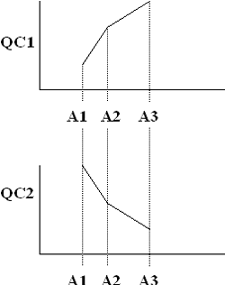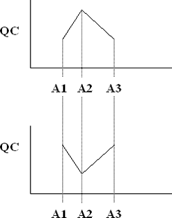 This points clearly to a “Technical Contradiction” between features QC1 and QC2. This connection between hyperbolic profile curves and technical contradictions has previously been described in Reference (2) for cases in which QC1 and QC2 are drawn on the two axes of the same graph. The connection with Taguchi factor effect plots hopefully serves to re-enforce the connection between this curve shape and the existence of technical contradictions.