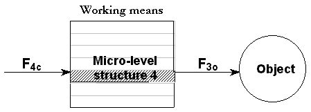 A schematic representation of transition to a micro-level (in its conventional understanding) is shown in Figs. 5a, b. The schematics reflects an immediate transition of a working means from a macro-level substance structure (i.e., S2) to a micro-level structure (i.e., S3). In the beginning, Fig. 5a, a control field F1c makes S2 generate an operation field F1c that is applied to an object S1; both fields act at the same macro-level of the substance structure (the substance hierarchy is shown with the help of the grid inside the block representing the substance). Transition to a micro-level, Fig. 5b, may require changing the substance structure (from S2 to S3) and both control and operation fields.
