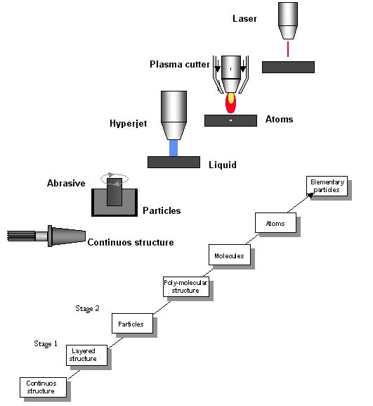 Transition to molecular/atomic/elementary particle levels has the most profound effect on a system performance, since at these levels, it is much easier to accomplish precise and adaptive control of the medium. Numerous examples in the history of technology illustrate this trend. Evolution of such mechanical units as propeller of an airplane, cutting tool in a machine tool, bucket of an excavator into jet of hot gases in jet engines, abrasive jets for machining, high pressure water jets for digging, respectively.