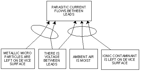 Before we jump into the examples, a short explanation about how to read a CRT and a CRD. A CRT is made up of two types of elements: “entities” and logical symbols, connected by arrows. Entities are single-idea, clear statements about the current reality, enclosed in a text box. Consider a plastic encapsulated microcircuit with 300 external leads (external conductors) separated by a fraction of a millimeter. The following are examples of entities: “there is voltage between leads”; “ambient air is moist”; “parasitic current flows between leads”; “ionic contaminant is left on device surface”. The ellipse is one of the logical symbols, and works like an AND logical gate. By joining those elements following certain logical rules one may get a better understanding of the current reality, as shown in the right branch of beside figure , which is read like this: IF “there is voltage between leads” AND “ambient air is moist” AND “ionic contaminant is left in device surface” THEN “parasitic current flows between leads” (effect). If a single cause (or an additional set of causes going through another ellipse) can give the same effect, there will be another arrow path going to the effect entity . In this case, we link the logical statements with the OR clause. Thus, the complete reading of that figure would be: IF “there is voltage between leads” AND “ambient air is moist” AND “ionic contaminant is left in device surface” OR IF “metallic micro-particles are left on device surface” AND “there is voltage between leads” THEN “parasitic current flows between leads”.