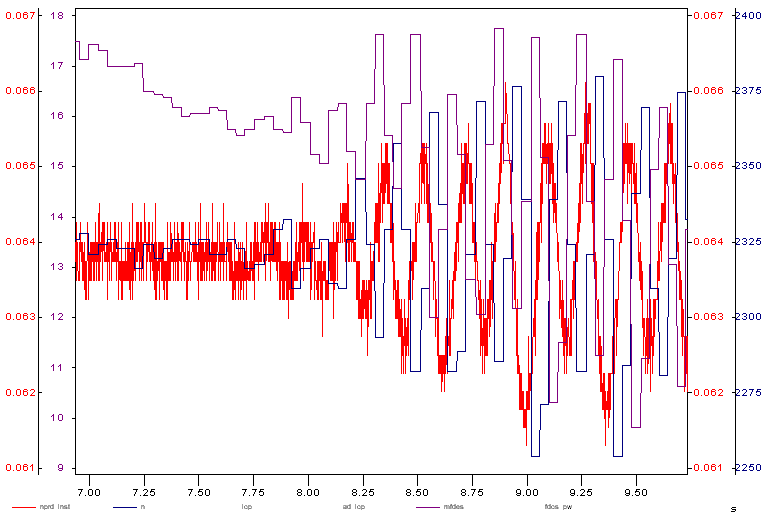 This plot shows three main signals of the control system: actual RPM, filtered RPM, and a command signal. As one can see, the command signal is completely out of phase with filtered RPM due to efforts of keeping constant speed in cruise control mode. Actual RPM is delayed from the command signal due to the mass inertia. Moreover, filtered RPM is delayed from actual RPM due to filtering calculation. The specific combination of these delays, or, in other words, combination of unified control system with individual characteristics of the particular engine, produces Hitching phenomenon. From the control system point of view, this is a classical instability problem due to the delay in the system feedback loop.