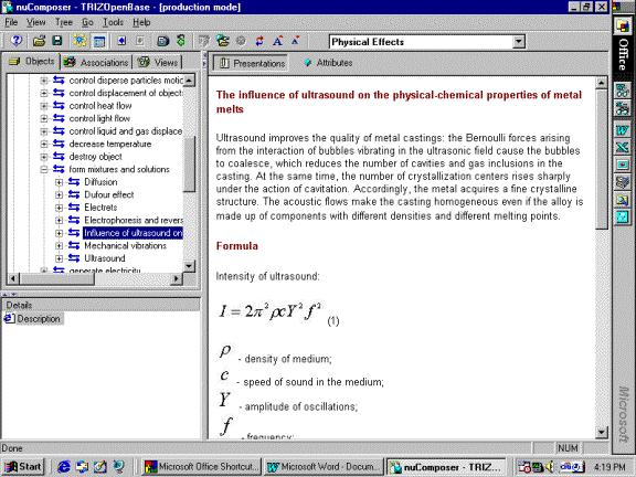 The TRIZ Explorer is built using a knowledge management system “nuComposer” and is provided with a help file and tutorial that guide the user in adding new data to the database, and in managing the data which have been accumulated. NuComposer can manage web pages, powerpoint slides, or Word documents, to add to any of the existing items, or to add new items.