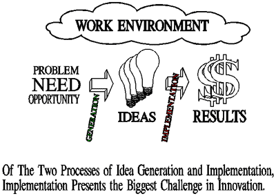 The third arena is Environment, and is focussed on the organization (leadership). The climate for Innovation is the perception of “what it is like to work around here,” and flows directly from the values expressed in behaviors of the leadership. We strongly believe that the Environment arena has the greatest impact of the three on the innovative output of any organization. This view is supported anecdotally, as well as by the work of Alan G. Robinson and Sam Stern. They note that 50% of the world’s supply of engineers live and work in Russia today, but not nearly 50% of the Innovations come from Russia, primarily because of the poor environment for Innovation. They quote a Russian engineer who said, “A bad system will beat a good man every time.” Consider that in 1946 when Genrich Altschuller, a patent examiner in the Russian Navy, showed Stalin his early work that lead to the development of modern TRIZ methodology, Stalin had him thrown in prison! A number of organizations have complained to this author that in spite of “creativity training” (Education arena), there was no observable increase in innovative output. The model of Figure 1 helps explain why this is so. Without a shared team problem-solving processes and strong leadership support to build and maintain an innovative environment, increased innovative output does not result. A widely held myth is that giving employees creativity training alone will result in sustained innovative output.