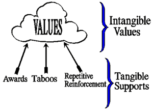 Consider the model of Figure 3. It displays the chosen value as an intangible, and it displays tangible supports for the value as legs of a three-legged stool. The three “support legs” are (1) Awards, (2) Taboos, and (3) Repetitive Reinforcement. The stated value is the “talk” of management while the tangible supports legs are the “walk” of management. In an ideal world, the “walk” of management matches the “talk,” meaning that management’s choices reflect the values they espouse. When there is a large disconnect between the “talk” and the “walk” management loses credibility and cynicism about the stated value results. One company talked about “quality” as a high corporate value, only to ship substandard product when they were in an oversold condition. You can see the problem.