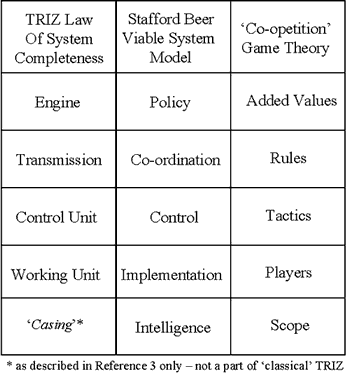 The overall correlation between three methods of looking at system ‘viability’ and/or ‘completeness’ which have essentially been developed completely independently of one another is quite remarkable. Figure 4 illustrates how each of the three methods - TRIZ, VSM and Game Theory - describe the 5 essential elements that define a complete system.