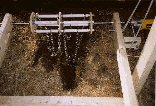 Work to date includes two prototypes. The first prototype was electrically powered, with a wooden frame. It was used to investigate the concept of digging with a flail-type device, and to develop the digging heads located at the ends of the chains. This device proved that digging was a viable concept. The first prototype dug the hole shown in Figure 3 in 30 seconds using a 1 HP motor.